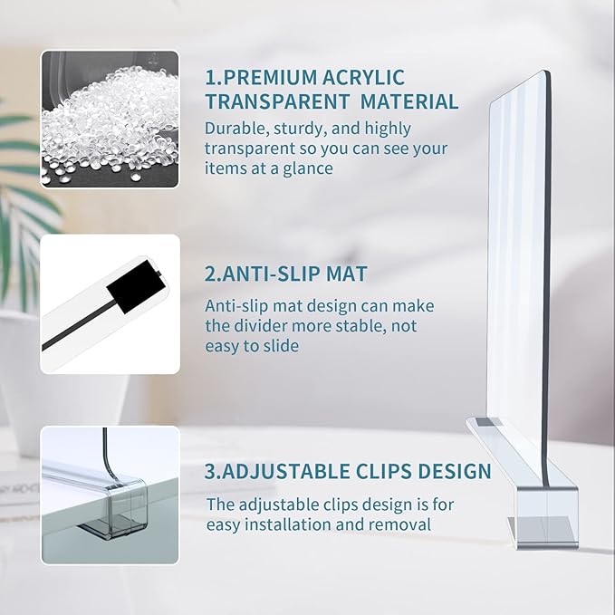 - 👍Upgraded Quality & Durability: These shelf dividers in closet are made of selected high quality acrylic material with advanced processing for better ductility and durability, will not deform, and are stronger, clearer, lighter and safer than glass, wood or chrome dividers. In addition, the bottom of the closet divider has an anti-slip mat that won't scratch your shelves when sliding. Our acrylic dividers will prove to be long lasting and are a great way to increase available storage space.
