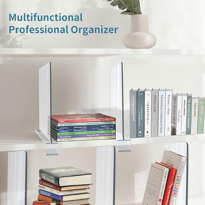 - 👍Multifunctional Organization Solution: The acrylic shelf dividers are great for organizing things. They can help you to separate large shelves into functional areas. Stack clothes, jeans, handbags, towels, blankets, bed linen, books, spice jars and other items neatly, keeping items upright to maximise storage space. Not just for your wardrobe, shelf dividers are also perfect for your kitchen, pantry, bedroom, office, living space. Make your home neater and cleaner. Ideal closet shelf organizer!