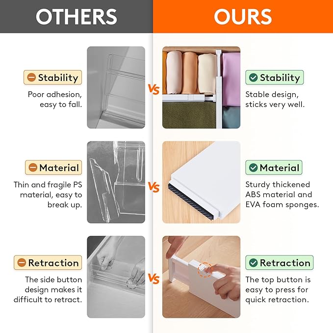 - Easy to Install: To adjust the length, press the top button before placing the drawer organizer, and then stretch it out again to secure it tightly. The strong spring tension keeps each organizer upright and secure. When retracting, press the top button and push in the stretched side.