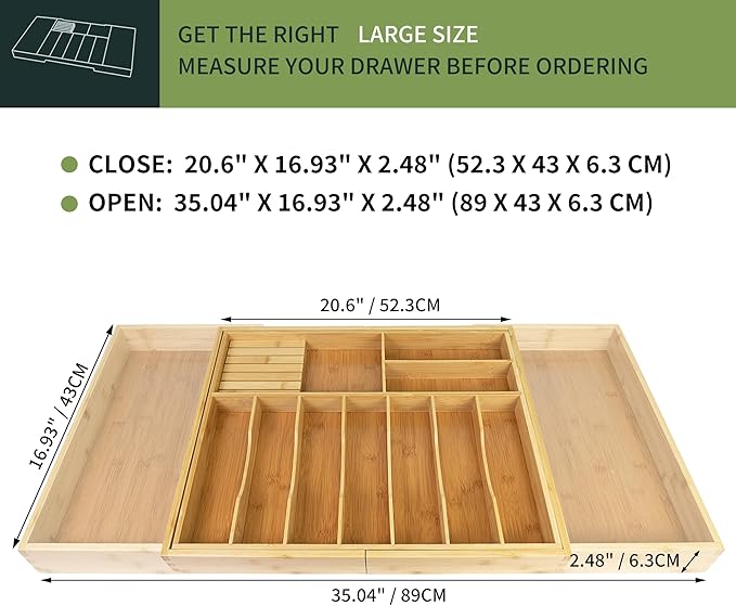- Adjustable design: VaeFae extra large silverware holder is expandable from 20.6" to 35.04" wide to fit larger drawers; You can expand on one or both sides for customized use