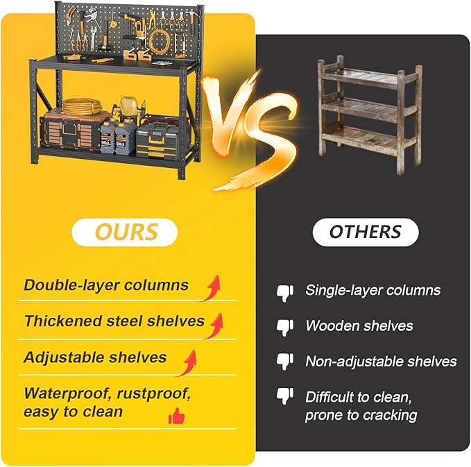 - 🏗 Exceptionally durable, heavy-duty load capacity.This heavy duty shelving unit features reinforced metal legs and strengthened shelves, forming an exceptionally sturdy metal storage system. As a professional garage storage solution, it safely supports heavy items such as tools and motor oil, offering far greater robustness than standard metal shelving or wire mesh racks. It is the ideal choice for heavy duty storage applications.